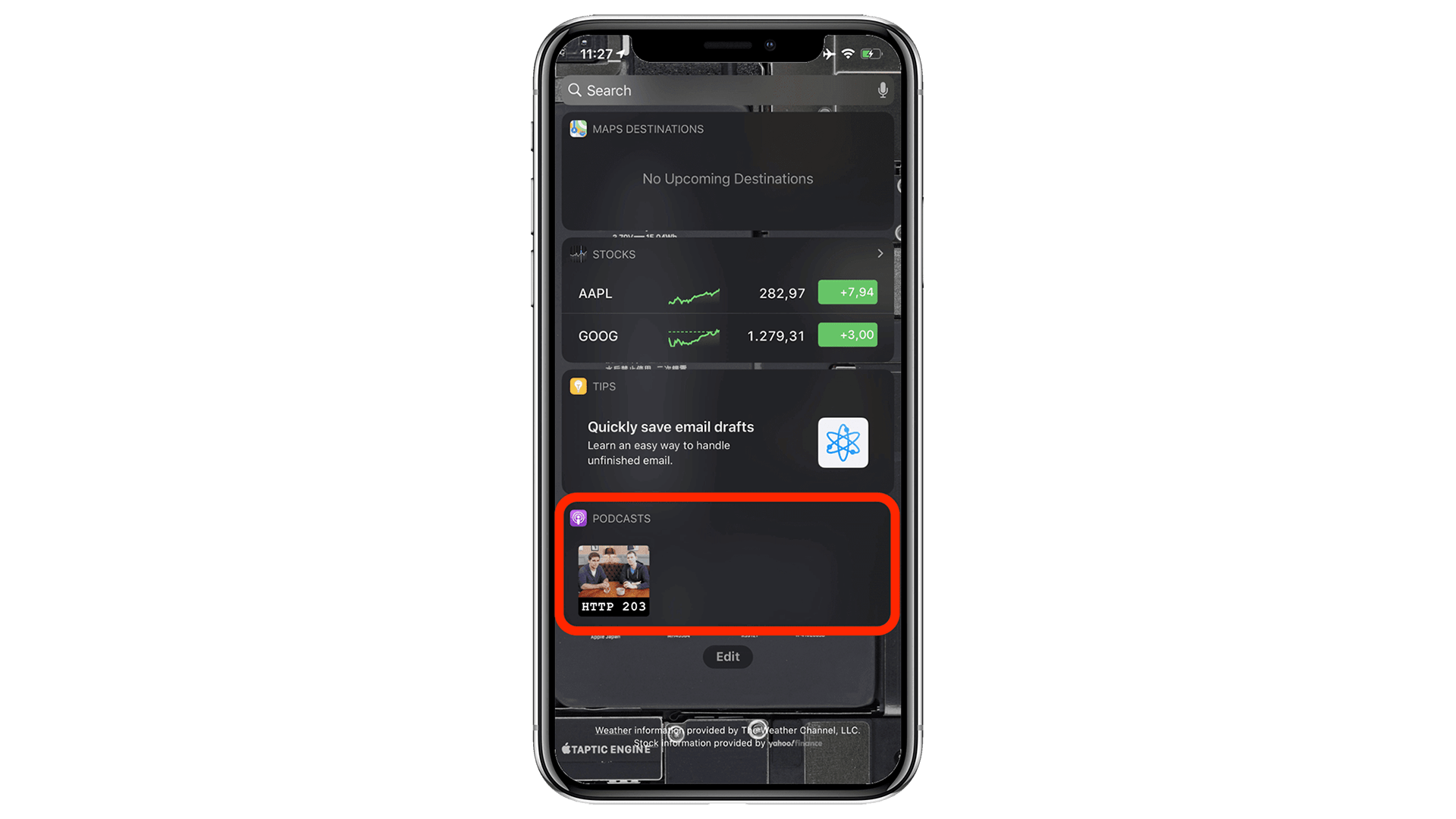 L'app Podcasts su iOS può mostrare contenuti in posizioni diverse dall'applicazione stessa, ad esempio nella visualizzazione dei widget del sistema o come suggerimento di Siri.