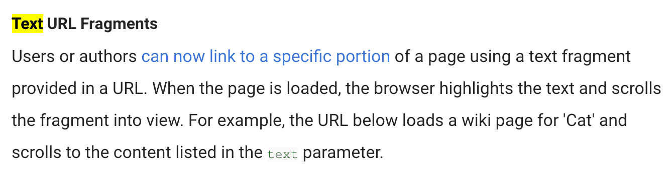 https://blog.chromium.org/2019/12/chrome-80-content-indexing-es-modules.html#:~:text=Text%20URL%20Fragments&text=text,-parameter&text=:~:text=On%20islands,%20birds%20can%20contribute%20as%20much%20as%2060%25%20of%20a%20cat's%20diet.